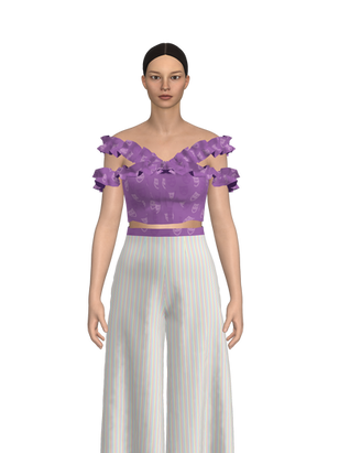 LOOK 3 - purple Crossed Ruffle strap boned bustier & rainbow-flecked Lavender wide-leg pants.