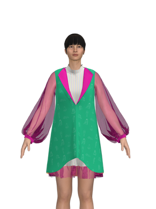 LOOK 2 - Rainbow-flecked mock neck dress with contrast chiffon ruffle & teal and pink Contrast cutout hem jacket dress with smiling flower zipper pull.