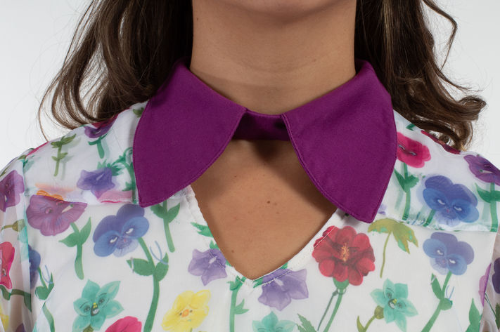 Blouse self - 20 momme Silk twill, Blouse lining - 14 momme crepe de chine, Floral self - 100% Cotton twill, Coral self - 95% Cotton 5% Spandex twill