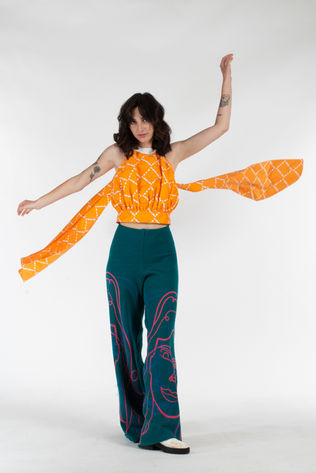 LOOK 7 - Orange and white Contrast collar bubble tank with detachable bow & dark teal digitally knit 'overlapping faces' jacquard wide-leg pants.